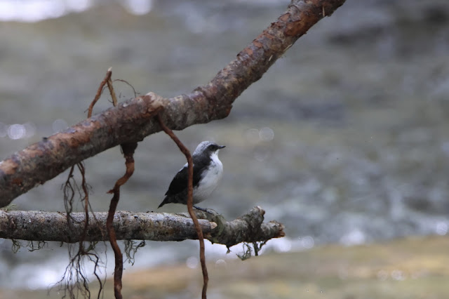 Once on the gravel bar I saw it - there was a dipper right in front of me.  I don’t know how I missed him, but due to the dark water with plenty of white rushing parts, the black and white bird tends to blend in.  He was not more than 10 feet from me, so I froze in my tracks.  Being so close I was just sure he’d flush, but he didn’t.  I did not feel I could even turn around to tell Charlie who stayed on the bank.  In about 30 seconds I felt I could slowly lower myself to the ground so as to not appear threatening, and the bird miraculously seemed to ignore me, hopping from stone to stone looking for food.