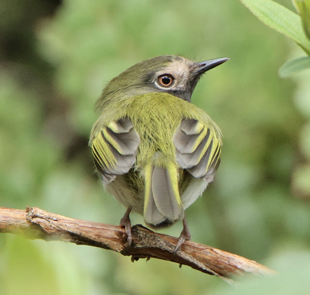 The next few stops - Purple-throated Sunangel, Speckled Hummingbird, Green-tailed Trainbearer, Rainbow Starfrontlet, Speckle-faced Parrot, Line-cheeked Spinetail, Sierran Elaenia, Mountain Wren and Gray-browed Brushfinch. This last entry, the Gray-browed Brushfinch was # 100 for the trip. At one point I walked back downhill to get the car, and when I returned John said, “I think I heard the Tody”. The Black-throated Tody-Tyrant has been my jinx bird on Cerro Toledo, and John finds it up there more often than not. No sooner had he said that and one popped up over my left shoulder, then flew across the road. A lifer: